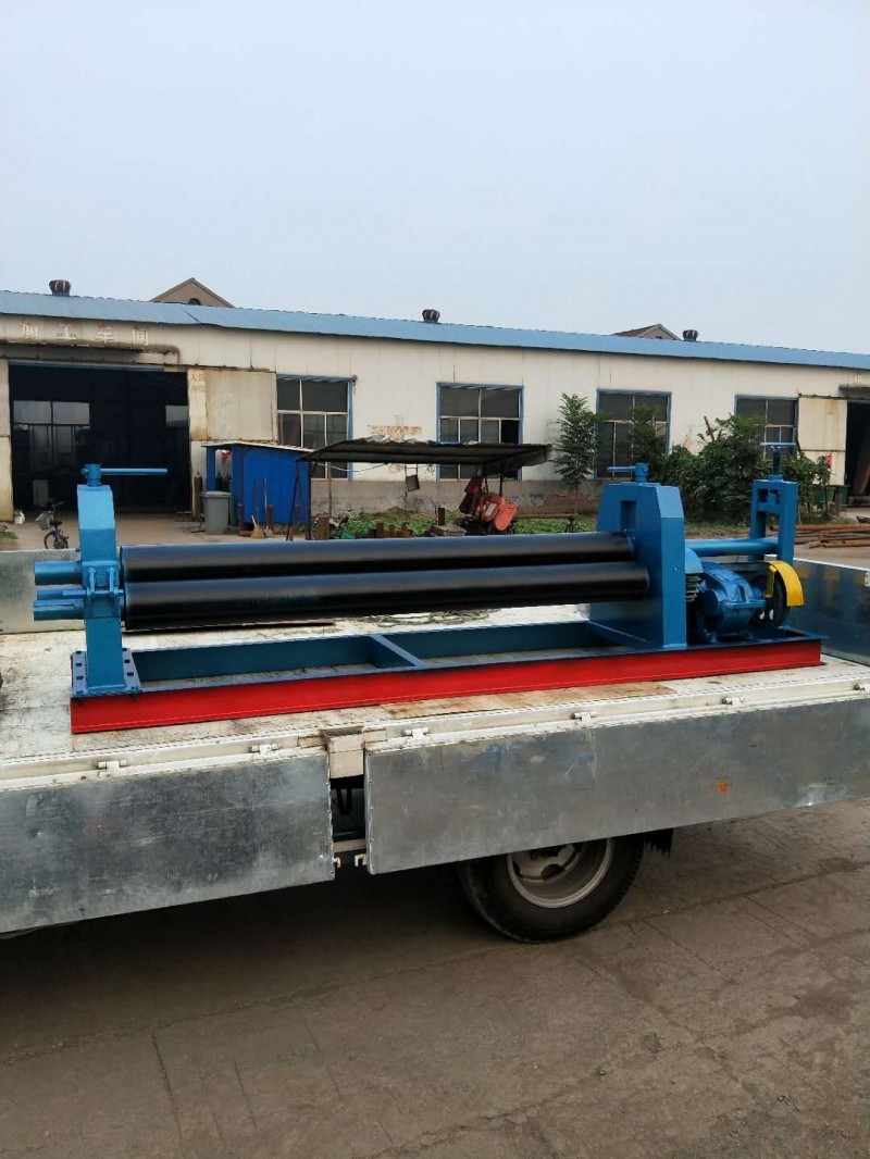 半自動卷板機結構形式為三輥對稱式。上輥在兩下輥中間對稱位置作垂直升降運動,通過絲杠實現上輥的升降,便使所卷制的材料變形,該卷板機是用于金屬板材型材彎曲、變型的一種通用設備,它借助于專用工具或其它設備來完成板材端面的預彎,可以卷制圓形、弧形工件,在石油、化工、鍋爐、水電、造船、工業設備安裝以及機械制造行業中有著廣泛的應用。該機器采用倒順開關(已安裝在卷板機上)來實現卷板的正、反轉,檢查機器無誤后,調節絲杠讓上輥壓至板材表面,把倒順開關打到“倒”“順”視現場板材的放入端而定讓電動機正轉還是把反轉,卷制一邊后,手動調節絲杠讓上輥壓緊板材在“倒”“順”卷制,如此循環直至達至要求為止。
