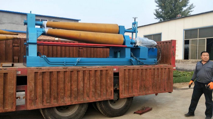 不銹鋼鋁板專用卷板機,表面掛聚氨酯,可以防止表面有劃痕. 該機結構型式為三輥對稱式,上輥在兩下輥 對稱位置作垂直升降運動,通過絲桿絲母蝸桿傳動而獲得,兩下輥作旋轉運動,通過減速機的輸出齒輪與下輥齒輪嚙合,為卷制板材提供扭矩。上輥可分離取料電動升降起輥。可安裝靠輪卷制錐體、角鐵、槽鋼等異異型鋼材。